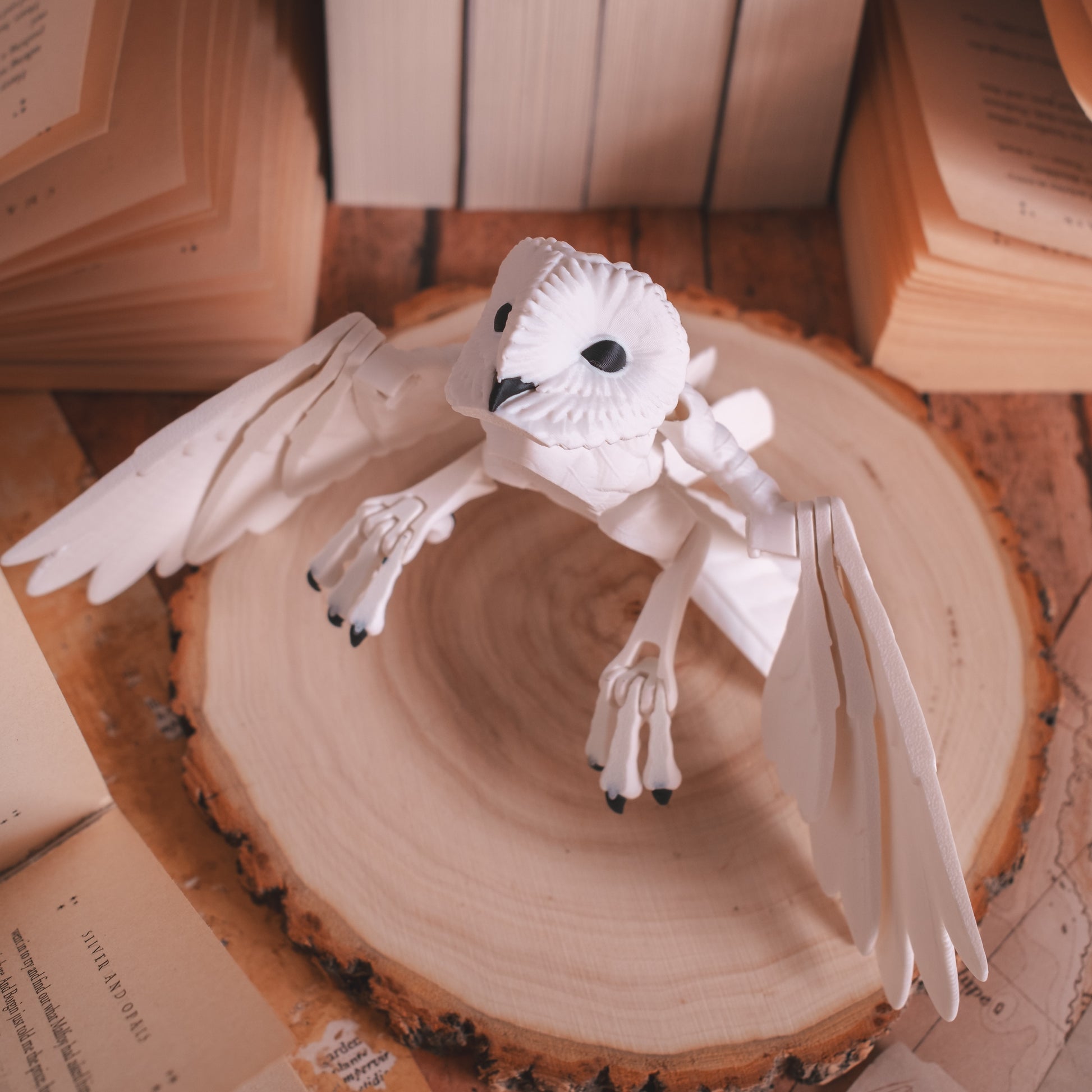 Our owl features articulating wings, claws, and head, allowing you to pose and display it in various lifelike positions. Whether perched majestically on a bookshelf or soaring through the air in your magical display, this owl adds a touch of enchantment wherever it goes.