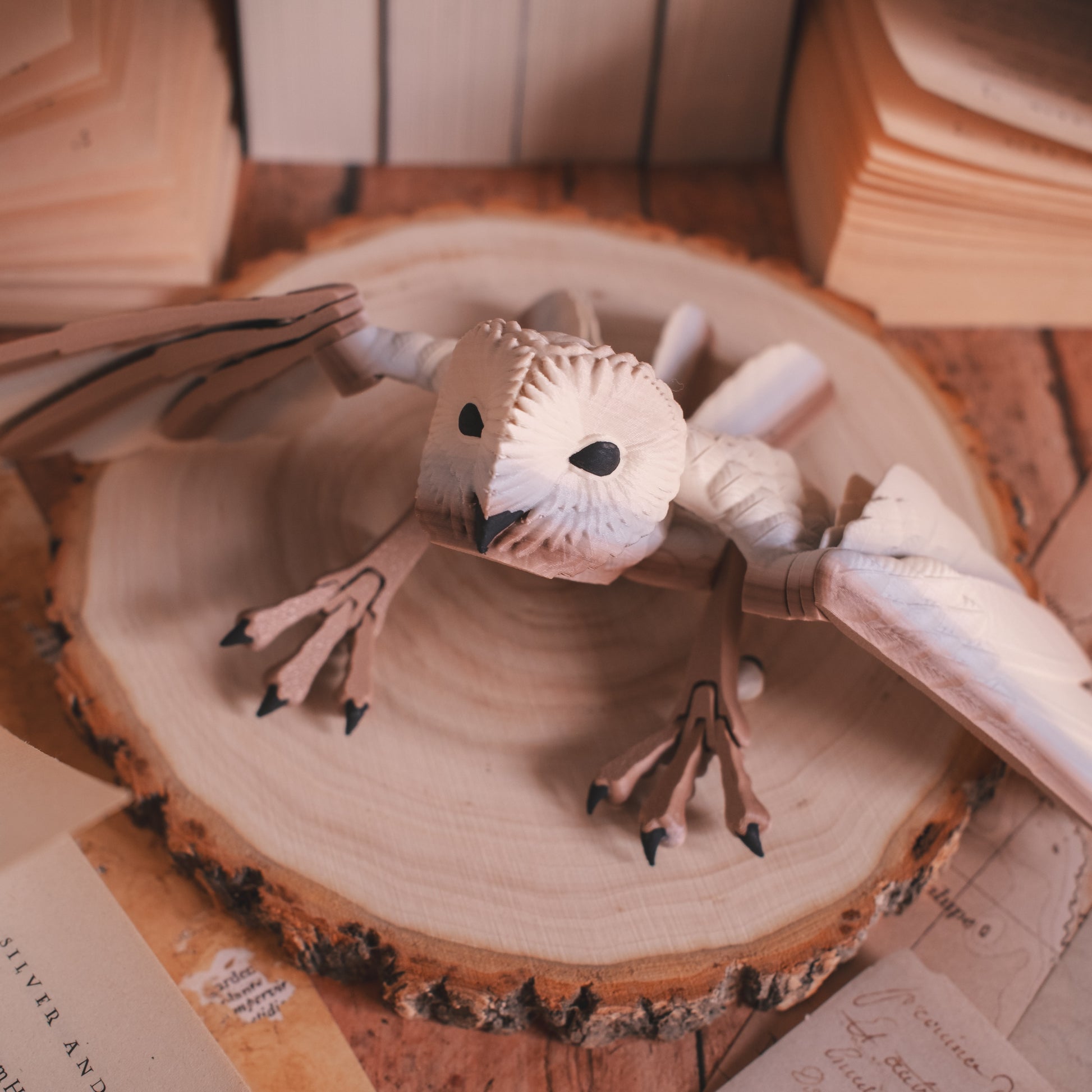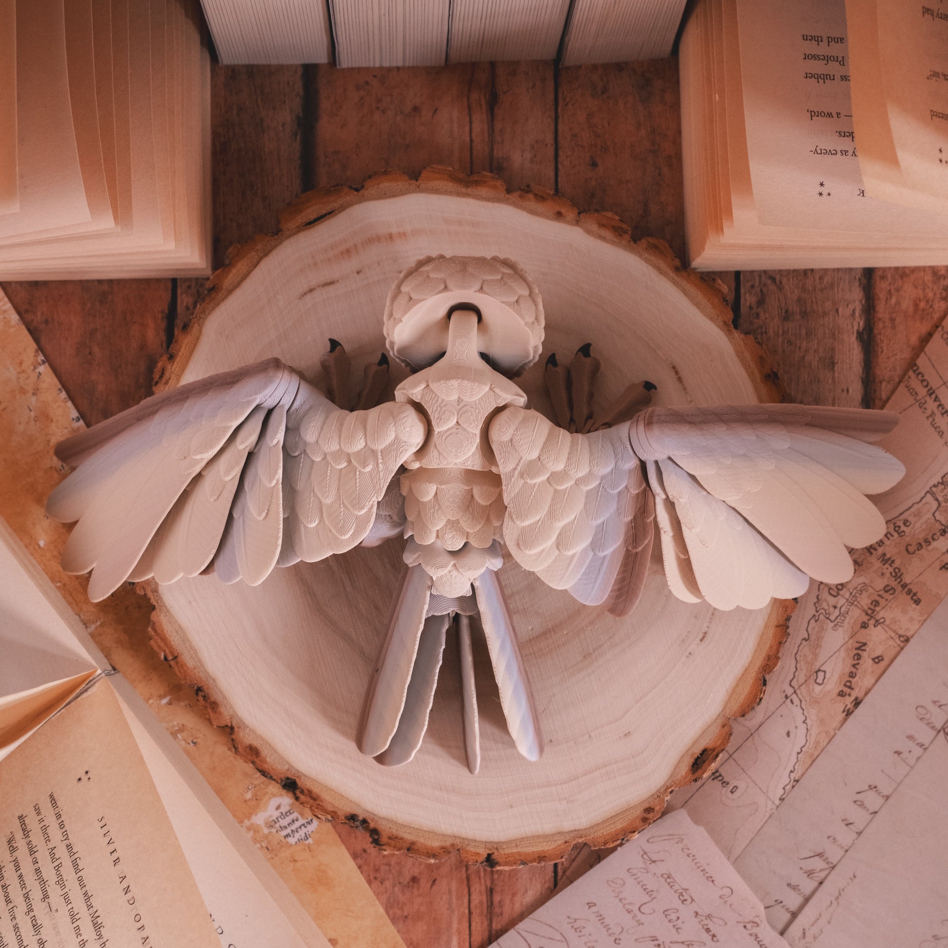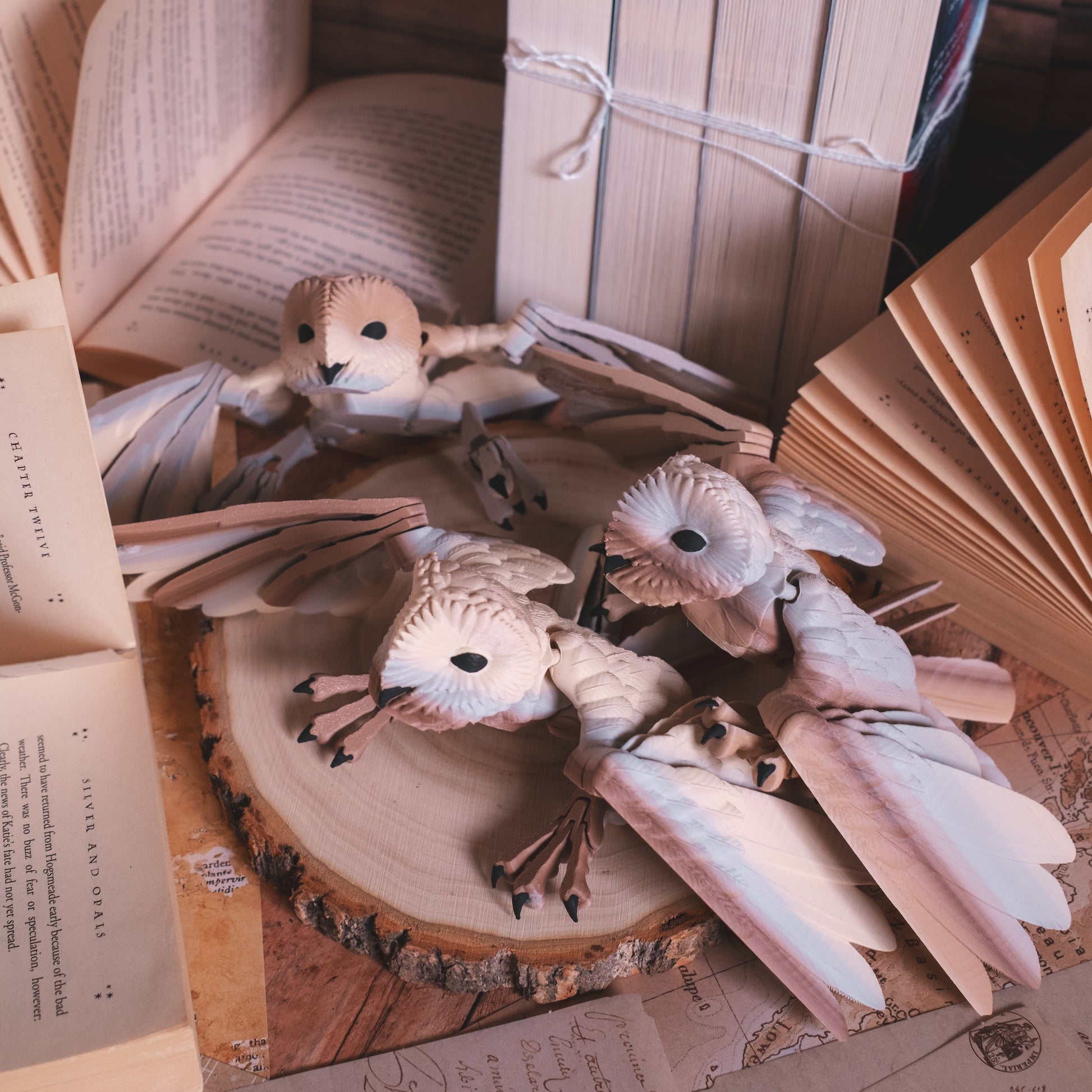 Our owl features articulating wings, claws, and head, allowing you to pose and display it in various lifelike positions. Whether perched majestically on a bookshelf or soaring through the air in your magical display, this owl adds a touch of enchantment wherever it goes.